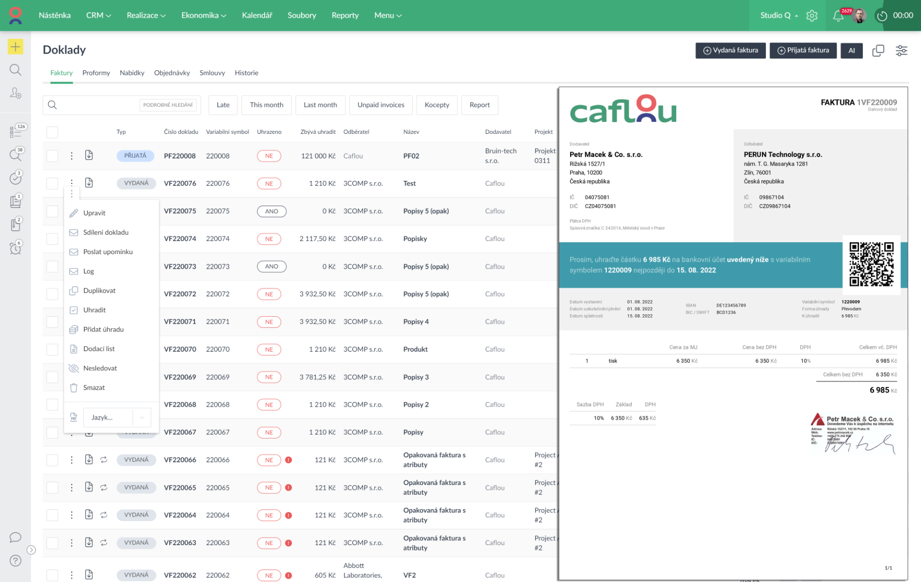 Caflou vám pomůže efektivně řídit celou firmu a její finance. Umožní vám sledovat cash flow i předvídat jeho budoucí vývoj. Zbavíte se rutinní práce, snížíte chybovost, zlepšíte týmovou spolupráci a zvýšíte výkon firmy. Vše na jednom místě. Odkudkoli a za dostupnou cenu.