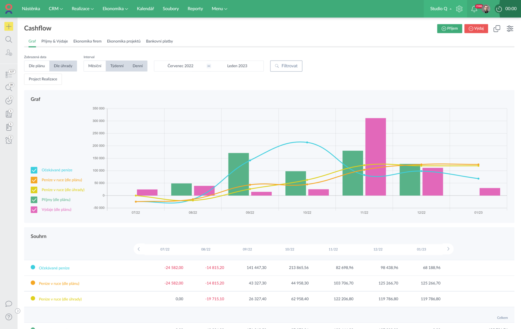 - Plánování a řízení cash flow. Sledujte a hlídejte veškeré příjmy i výdaje – plánujte cash flow jak pro celou firmu, tak i podle zákazníků, dodavatelů nebo po jednotlivých projektech.