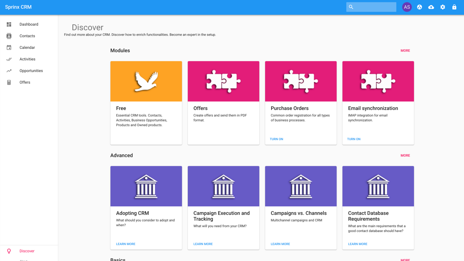 Sprinx CRM je kompaktní a uživatelsky přívětivé CRM, ve kterém se uživatelé rychle zorientují. Zároveň je bohaté na funkcionality a přístupné kdykoliv a na všech zařízeních. Aplikace je vyvinuta s ohledem na současnou technologii a trendy. Práci se Sprinx CRM si lze vyzkoušet v plně funkční free verzi, která obsahuje veškeré hlavní funkce, jako například pokročilé řízení kontaktů, aktivity, obchodní příležitosti a kalendář.